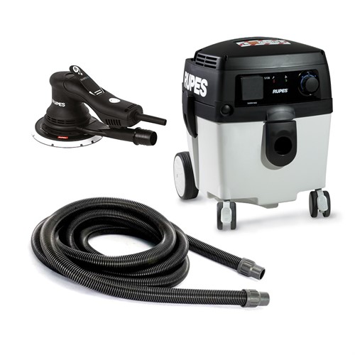 Rupes Skorpio E2 Random Orbital RX256A – en oscillerande slipmaskin med borstfri motor med hela 6 mm orbit vilket ger en otroligt snabb och effektiv avverkning. Mjuk startfunktion, elektrisk motorbroms samt ergonomisk design gör slipmaskinen enkel och bekväm att använda, både med en-eller tvåhandsfattning. Rupes S130 L slipdammsugare med en 230V dubbelkammarmotor som gör slipsugen tystgående utan att göra avkall på sugeffekt. 5 m antistatisk utsugsslang med klämmor för slipmaskinsladd.
