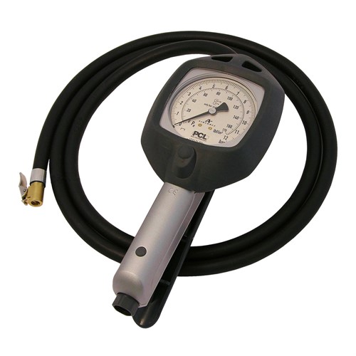 Modernt designad luftpåfyllare med stötabsorberande hölje. Alla manometrar, mätområde 0 – 12 bar, är individuellt provade och testprotokollen medföljer. Direktverkande ventil för såväl snabb luftning som tömning. Tillverkad i enlighet med direktiven EC86/217/EEC. Levereras med 1,8 m slang och pumpnippel med låsning.